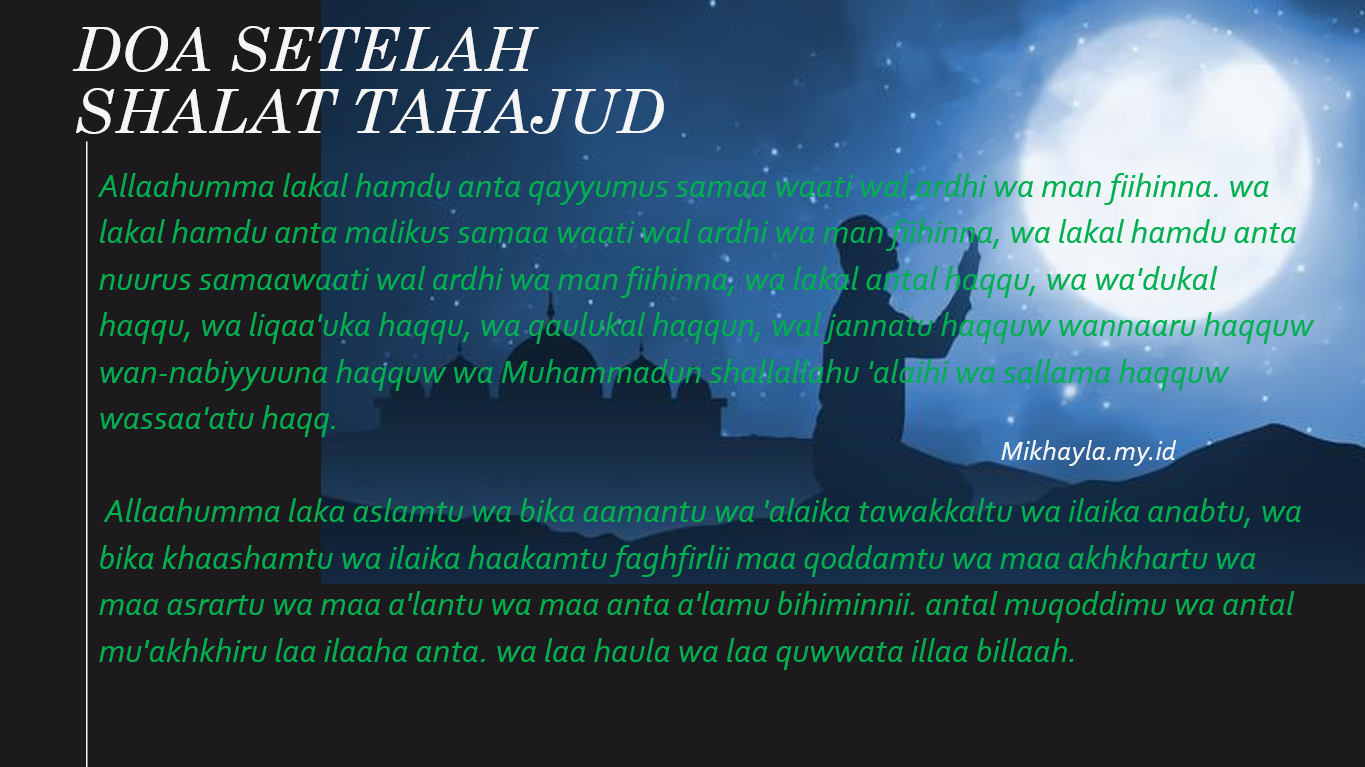 Artinya : “Ya Allah bagi-Mu-lah segala puji, Engkaulah yang mengurus langit dan bumi serta semua makhluk yang ada pada keduanya. Dan bagi-Mu segala puji, Engkau Raja langit dan bumi beserta semua makhluk yang ada pada keduanya. Dan bagi-Mu segala puji, Engkau cahaya langit dan bumi beserta semua makhluk yang ada pada keduanya. Dan bagi-Mu segala puji, Engkau Maha benar, janji-Mu adalah benar, pertemuan dengan-Mu adalah benar, ucapan-Mu adalah benar, surga adalah benar, neraka adalah benar, para nabi adalah benar dan Nabi Muhammad Saw adalah benar serta hari kiamat adalah benar.”